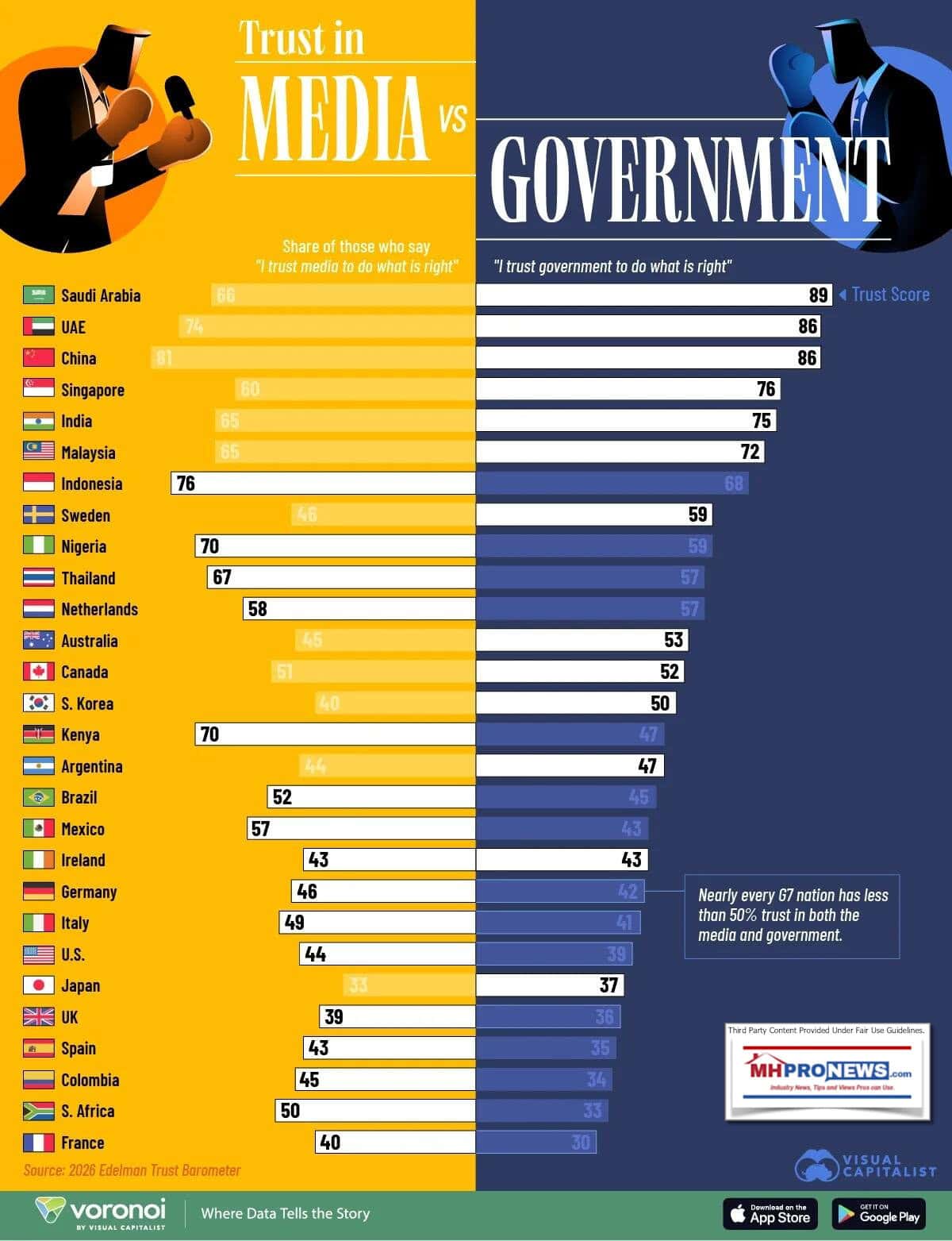 According to the 2026 Edleman Trust Barometer polling infographic generated by Visual Capitalist, only 44 percent of the U.S. population say: “I trust media to do what is right.” Only 39 percent say: “I trust government to do what is right.” That survey may be generous; other polls in recent years have not been as rosy in their support for government or media. So, when media across the left-right divide provide a rosy outlook for the Housing for the 21st Century Act (H.R. 6644), or when special interest groups – including the Manufactured Housing Institute (MHI) – praise the bill, that may not be a solid cause for celebration of the bill that has now been advanced to the U.S. Senate. According to the results from the search tool of the MHI website, pre-dawn on 2.12.2026 there were no publicly available posts that included their letter of support for the Housing for the 21st Century Act (H.R. 6644). Fortunately, the House Financial Services website does have a pull quote from MHI. “Manufactured Housing Institute (MHI) said, “The Manufactured Housing Institute (MHI) writes in support of the bipartisan Housing for the 21st Century Act (H.R. 6644). This comprehensive package will expand development capacity, lower costs for renters and homeowners, and simplify the regulatory framework so more families can achieve the American dream of homeownership. As the national trade association representing every sector of factory‑built housing we understand the urgency of increasing housing supply and reducing costs. This legislation offers practical solutions that will accelerate production and expand access to affordable homeownership and rental housing. We strongly support this legislation and encourage its swift passage.”” Taken at face value, that certainly sounds encouraging. But as a pull quote from a third-party to the manufactured housing industry cited in Part I reflects: “In summary, while H.R. 6644 offers marginal, positive steps (especially chassis removal), it doesn’t deliver the structural enforcement needed for manufactured housing to reach its potential.”