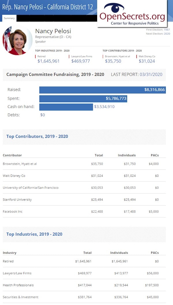 Pelosi’s backers include Disney, which owns ABC and other media assets. Facebook, LinkedIn, Google, multiple Berkshire brands, and even right-of-center Fox News parent News Corp supported Pelosi’s political campaign in the current 2020 cycle. Pelosi – a multi-millionaire – in turn supports numerous other Democratic candidates, all per FEC records as reported by Open Secrets.