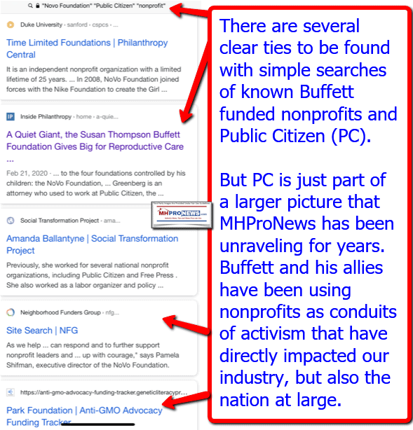 “Public Citizen uses lobbying, litigation, research, and advocacy[13] to push a broad liberal policy agenda,” said Influence Watch. Other philanthropy watch groups on either side of the left-right divide cite ties between Public Citizen and Warren Buffett, Chairman of Berkshire Hathaway which owns Clayton Homes, 21st Mortgage Corporation, Vanderbilt Mortgage and Finance, and numerous other brands which tend to dominate the Manufactured Housing Institute (MHI), has ties through nonprofits funded by Buffett to Public Citizen and a range of left wing groups and their leaders.