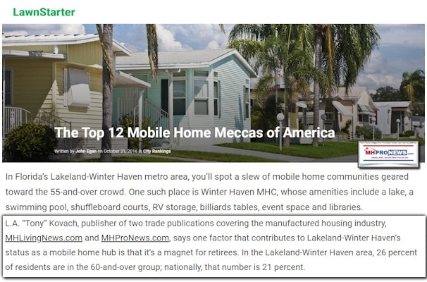 A LawnStarter “review of U.S. Census Bureau data shows that last year, 21.5 percent of all homes in Lakeland-Winter Haven, including houses, apartments and condos, were mobile homes. That’s the highest percentage among the country’s 100 largest metro areas. By contrast, 6.4 percent of all U.S. homes in 2015 were mobile homes, according to the Census Bureau’s American Community Survey.” They interviewed L. A. “Tony” Kovach for that report.