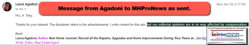On Dec 28, 2020, 5:11 PM, following the message to the Motley Fool/Millionaire Acres media relations manager above, story writer Laura Agadoni sent the following reply. The emphasis and colors in the screen capture below are in her original.