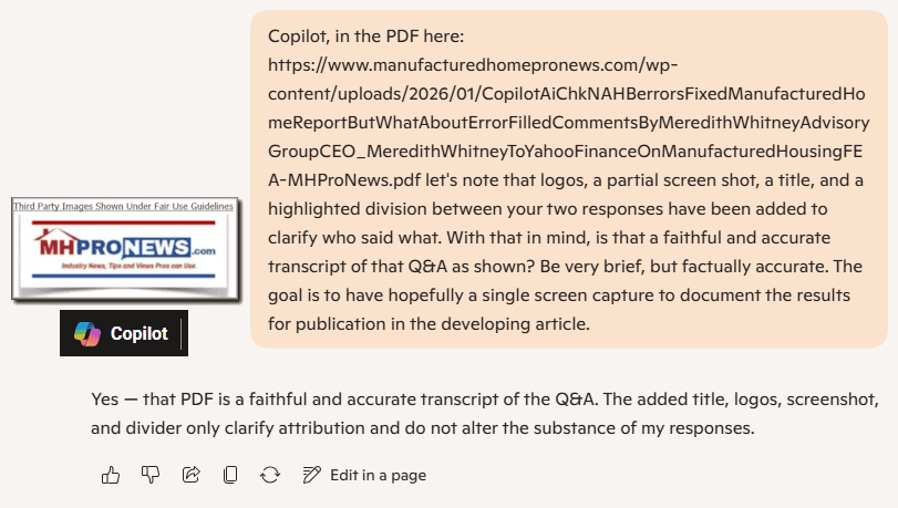 So, to Gemini’s point about the contrast between NAHB’s handling of the errors on a Sunday morning vs. Yahoo’s and Meredith Whitney’s handling of concerns over errors in their report, the differences are significant. But to further clarify and cross check, MHProNews asked left-leaning Bing’s AI powered Copilot to check both the human intelligence (HI) analysis of the above as well as the Gemini artificial intelligence (AI) results.