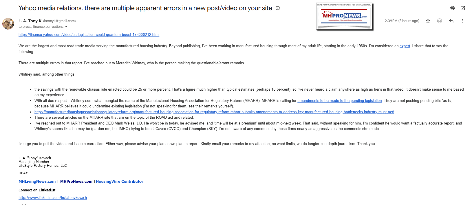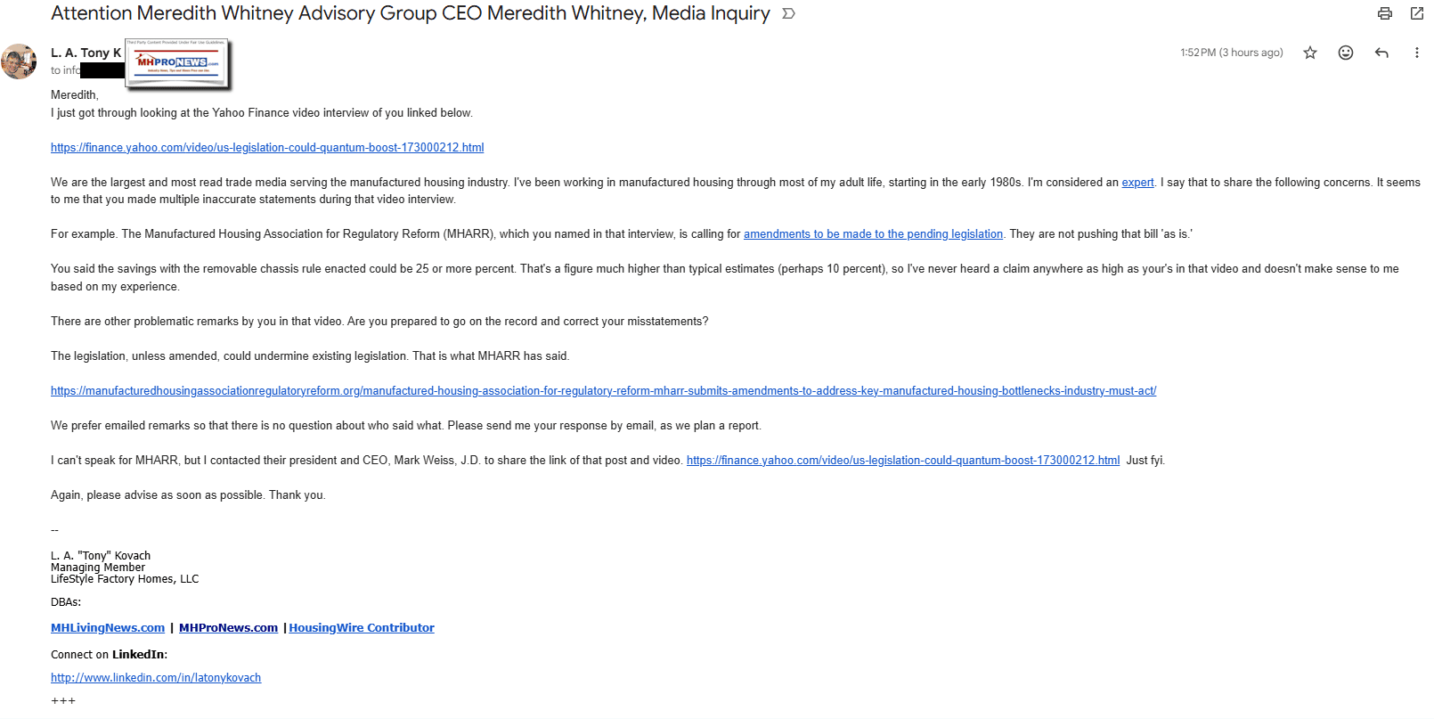 - Your emails to Meredith Whitney and Yahoo Finance are quoted in full and clearly attributed as MHProNews outreach.
