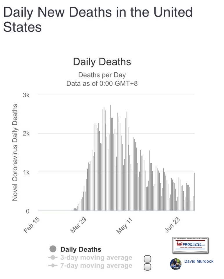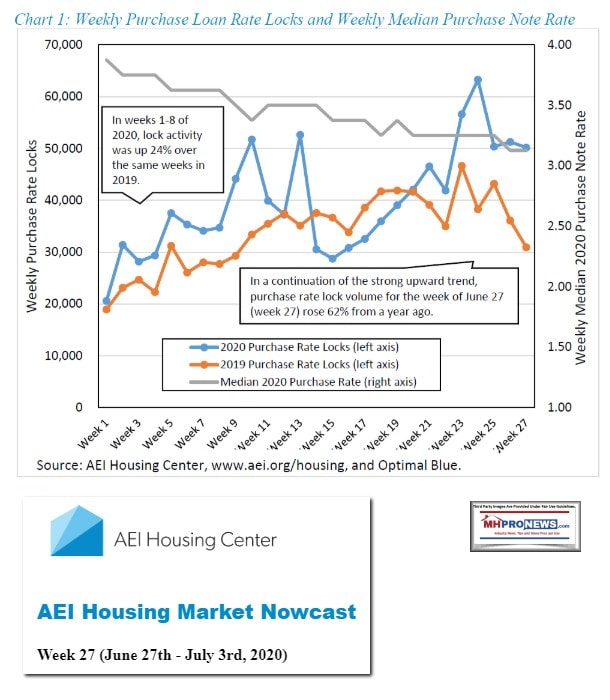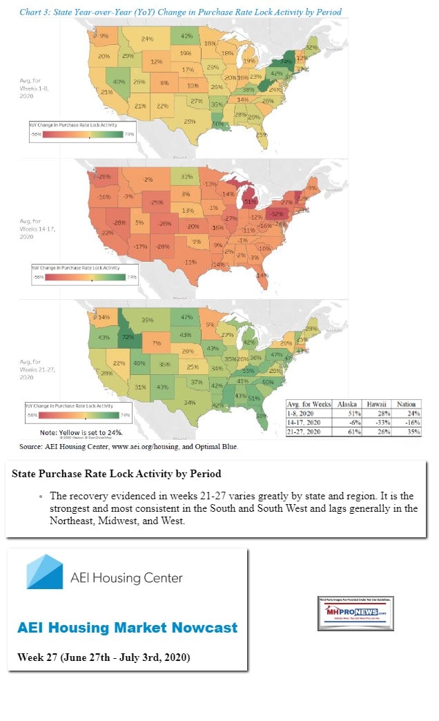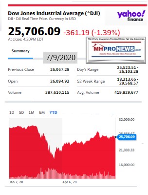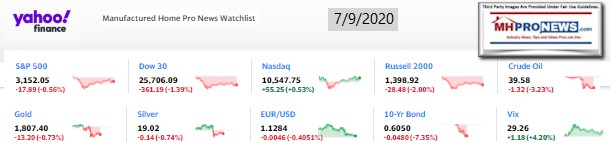 Having set the table with that backdrop, the AEI Nowcast for the 27th week of the year, June 27th to July 3rd, 2020 data, will be our featured focus. It will include some manufactured housing related observations. That report is found beyond the left-right headline news bullets and 2 of our 3 market snapshots at the close today. The manufactured housing industry connected stocks are near the end of the report each evening, after the featured focus and the related/recent report links.