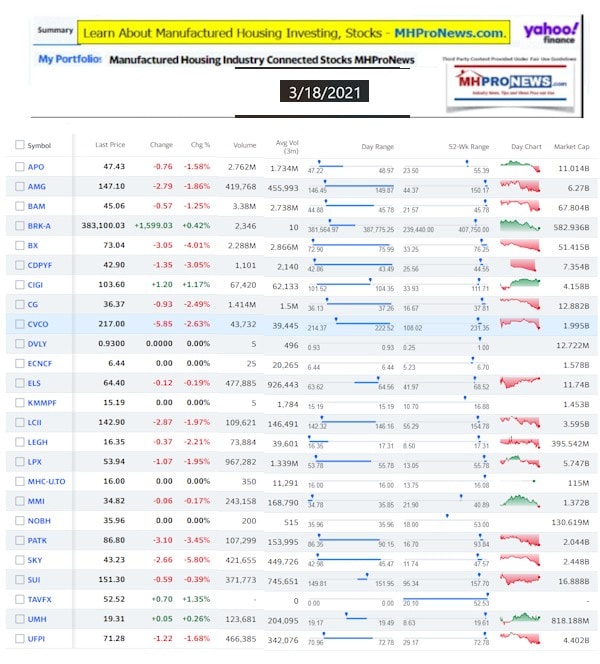 Manufactured Housing Industry Investments Connected Closing Equities Tickers