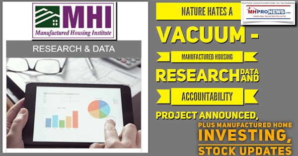 On a mostly down day for manufactured home connected equities, let’s press ahead toward the focus on a new resource for manufactured housing industry data to fill the void that MHI apparently has opted to leave.