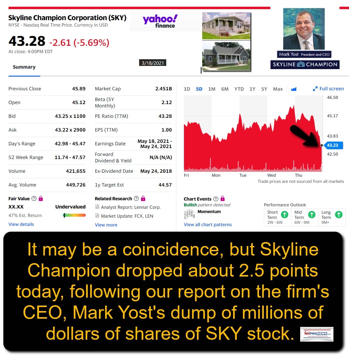 In a quick segue before pressing ahead, the following from yesterday’s report on Mark Yost, CEO of Skyline Champion insider sale of millions of shares of SKY stocks. While the MH stocks did largely decline, Skyline is supposedly “undervalued” per analysists. Still, their stock dropped sharply today.