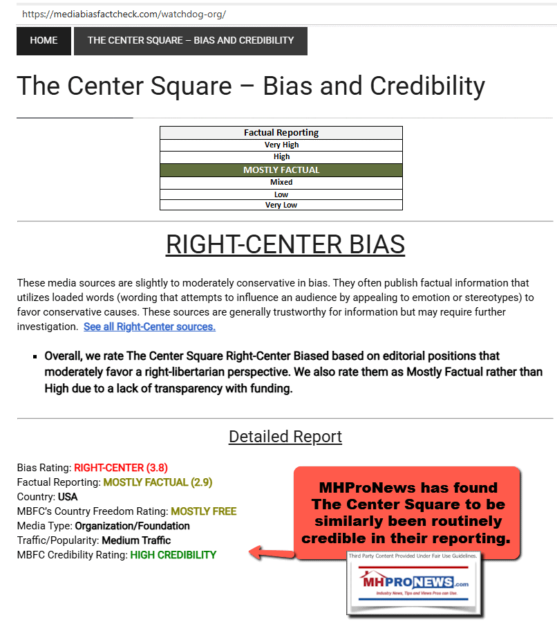 Part I. From The Center Square to MHProNews is the following provided article from the page linked here. Media Bias Fact Check has rated as “high credibility” in their credibility rating.