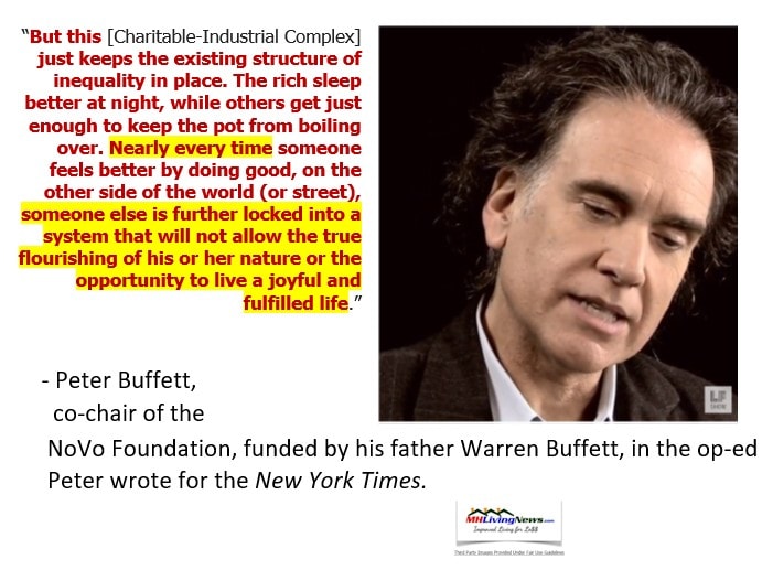 Peter Buffett, Warren’s son, runs the NoVo Foundation with his wife Jennifer, as was noted above. Peter said the following.