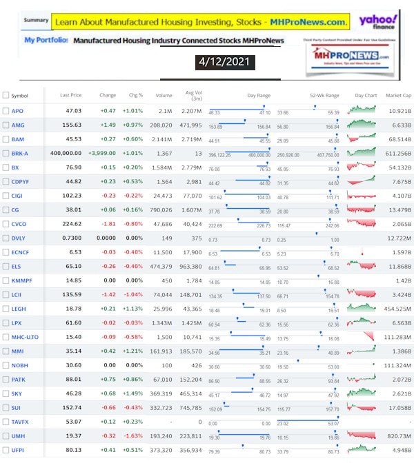 Manufactured Housing Industry Investments Connected Closing Equities Tickers