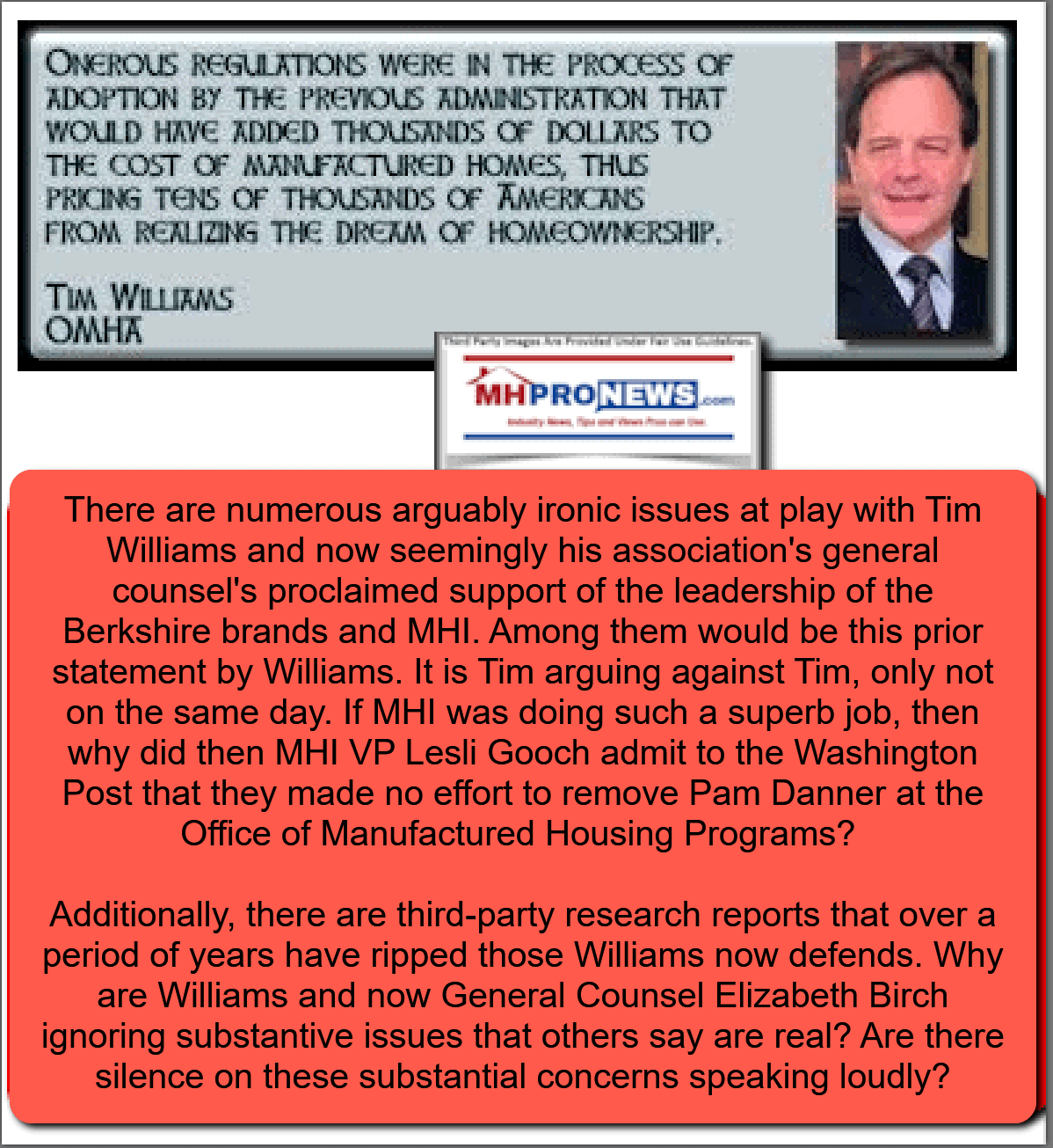 In the article in question, MHProNews outlined a range of voices, some from within MHI, others from outside of that group. The consensus of those quoted also happens to fit the known facts, which even Gooch admitted to in writing. The problem that leaves Gooch, Williams, Birch and others are the allegations that the system has been rigged to limit lending. That and more were ignored in the by Birch and Williams. Why?