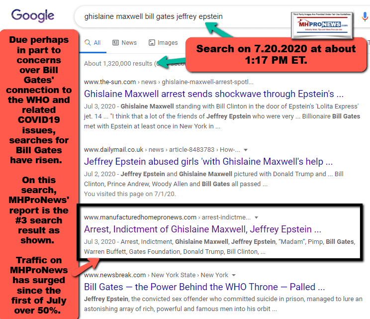 https://www.manufacturedhomepronews.com/arrest-indictment-of-ghislaine-maxwell-jeffrey-epstein-madam-returns-bill-gates-warren-buffett-gates-foundation-donald-trump-bill-clinton-others-to-sexual-predator/ That screen capture is from the date shown, but since then one of the topics in an article by MHProNews shown further below topped some 2 million hits. By striving to document facts, and separate fiction from reality, several of MHProNews reports create enduring value and reader engagement. A willingness to explore issues involving high-profile individuals and companies in a thoughtful way has both risks of being ‘cancelled’ or mocked, but also has rewards when those reports prove to be properly reported. The topic search below was a later screen capture that revealed a similar pattern of heavy engagement on this topic.