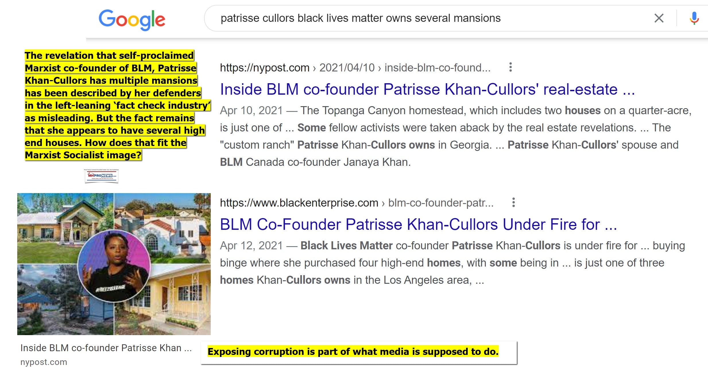 https://www.manufacturedhomepronews.com/we-are-trained-marxists-black-lives-matter-blm-co-founder-patrisse-cullors-deception-and-misdirection-capital-research-center/ Since our prior report on Patrisse Khan Cullors, concerns about the authenticity of her cause have emerged. Is BLM just another corrupt institution that rewards a few at the top? Several of the illustrations shown in this report can be opened in many browsers to reveal a larger size. To open this picture, click the image once. When the window opens, click it again to reveal the larger size photo. Use your browsers back key to return to the article.