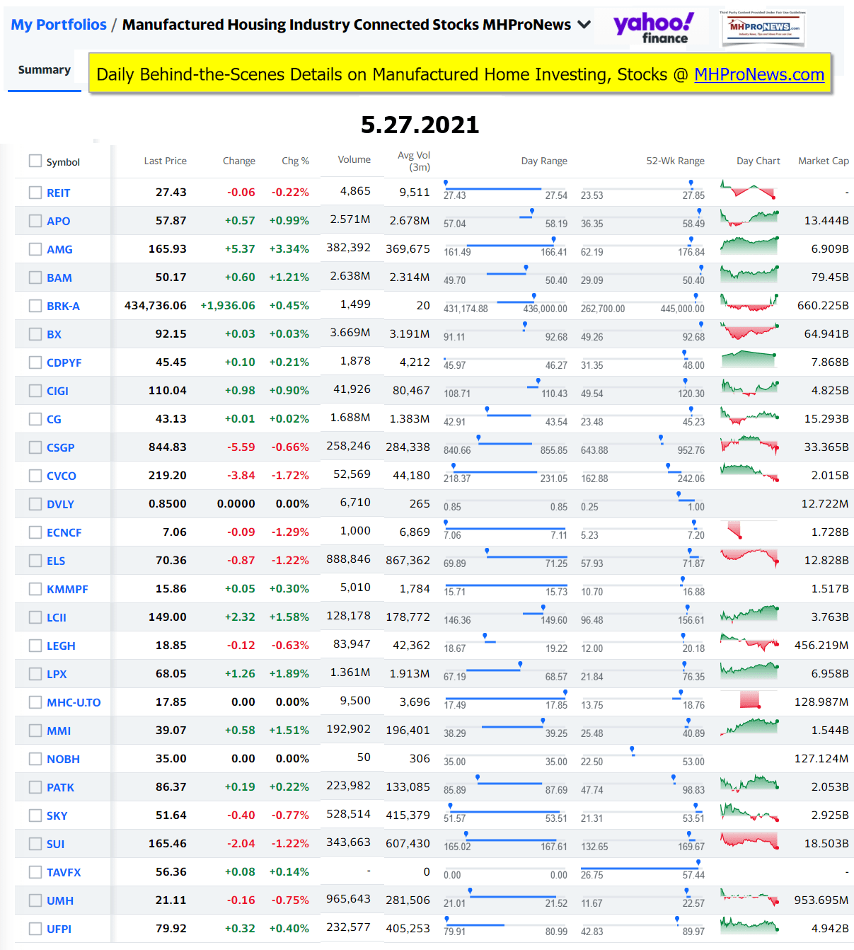 Manufactured Housing Industry Investments Connected Closing Equities Tickers