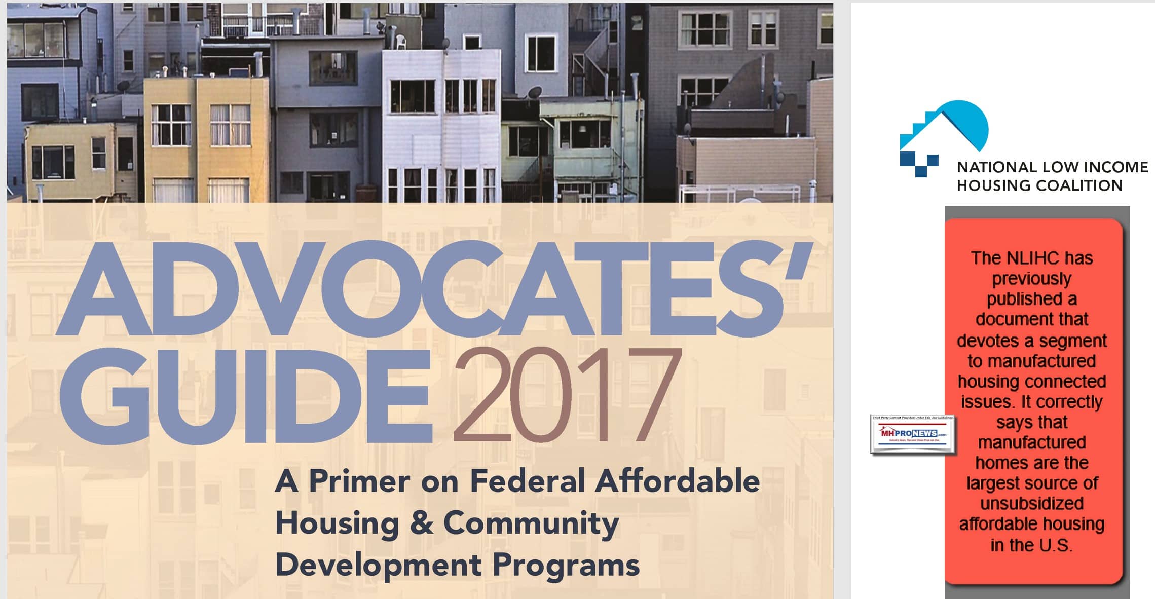 As evidence, in another one of their publications, a 2017 “Advocates’ Guide” book-length coaching document, the NLIHC has section devoted specifically to manufactured housing. That document says the following.