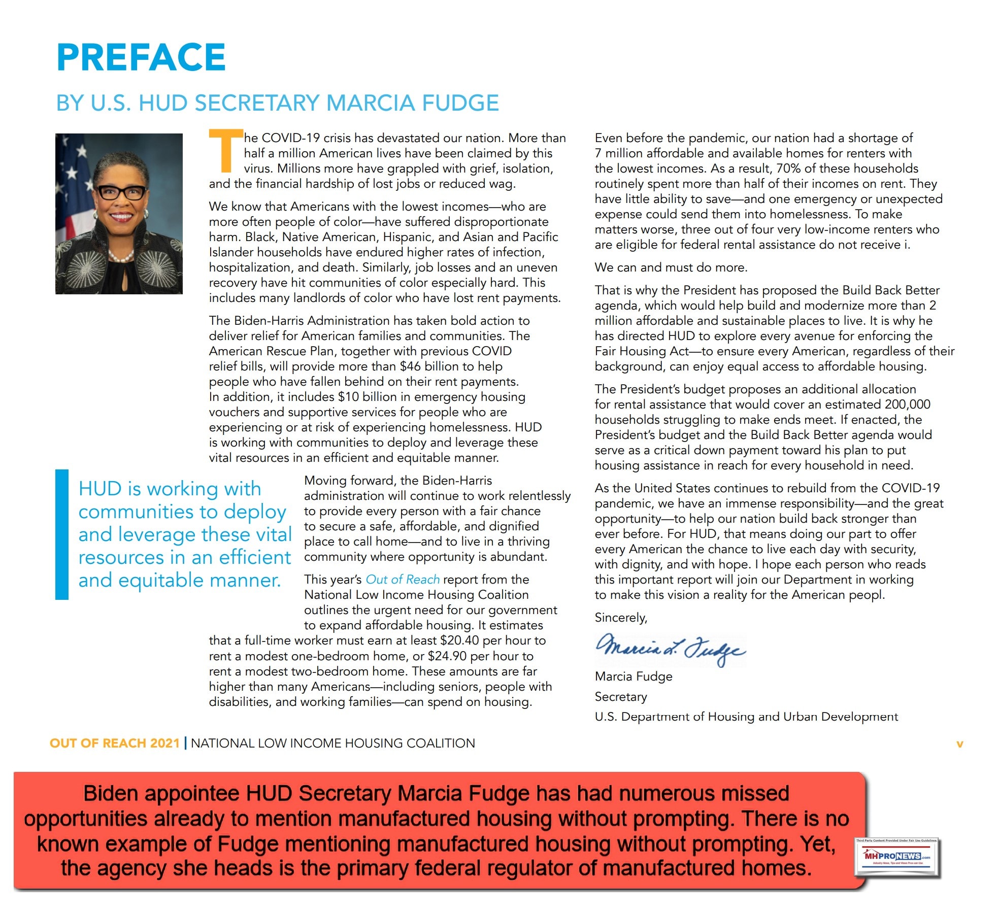 Among the statements in their Out of Reach 2021 is a forward by HUD Secretary Marcia Fudge. Fudge, along with the balance of their report, also failed to mention manufactured housing as part of the affordable housing solution. That’s troubling, given that Fudge heads up the agency that is the primary regulatory of affordable manufactured homes. Thus another takeaway is this. Despite MHI’s apparently playing footsy with Fudge and teeing up nearly meaningless softball questions for her, unlike former HUD Secretary Ben Carson, Fudge has not yet mentioned manufactured housing in a context apart from MHI involvement.