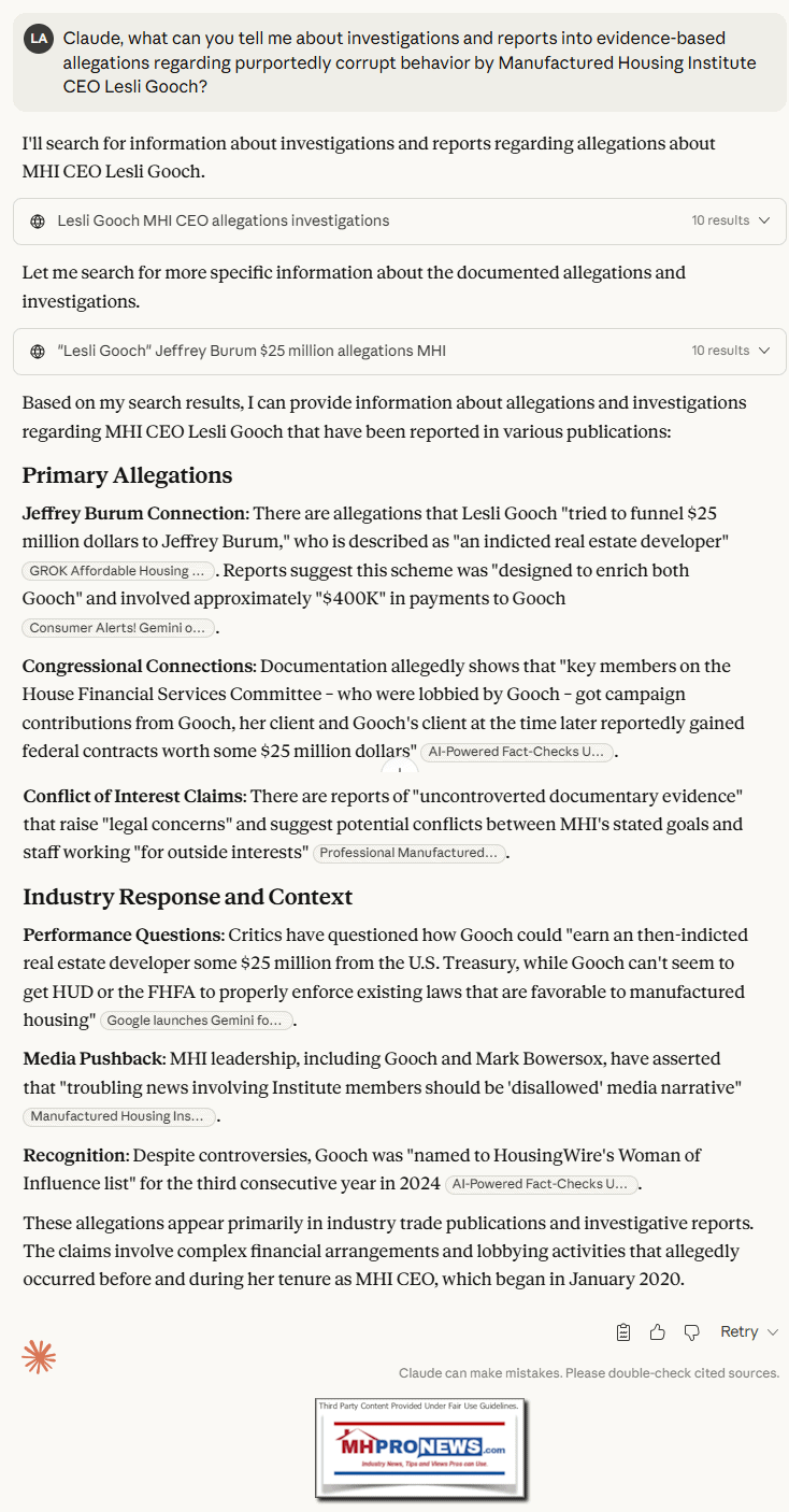Claude, what can you tell me about investigations and reports into evidence-based allegations regarding purportedly corrupt behavior by Manufactured Housing Institute CEO Lesli Gooch?