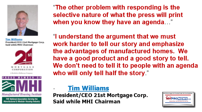 Tim Williams, while still MHI’s chairman, ironically underscored some of the points made by MHProNews, MHLivingNews and others. Williams said the industry must tell its story because we have a good story to tell. That’s demonstrably true.