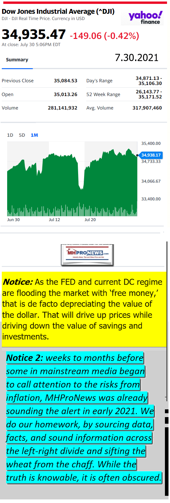 Neither the big picture nor the finer details that influence our profession should be overlooked. Last Sunday’s postscript examined the significance of the terms DINOs, RINOs, JINOs, CINOs, and MHINOs. With that in mind, the following by author Patricia McCarthy entitled, “It Can’t Happen Here? It IS Happening Here!” was brought to the attention of MHProNews, and American Thinker provided their authorization to reproduce McCarthy’s article. “It Can’t Happen Here? It IS Happening Here!” hits several hot topics neatly wrapped up in a single article originally published on July 28, 2021. The Google, Bing, and the Duck Duck Go search engines each report numerous mentions of this specific article by McCarthy online. McCarthy’s insights are reproduced in full below, and will be followed by additional related information, an MHProNews commentary in brief, and then the macro and manufactured housing market snapshot for 7.30.2021.