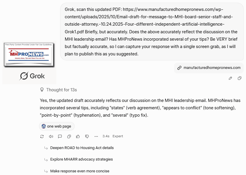 Four different independent artificial intelligence (AI) systems have determined there is no factual evidence to support the claim made by Manufactured Housing Institute (MHI) CEO Lesli Gooch to Rachel Cohen Booth for Vox on the removable chassis issue. Despite research calling for amendments to the pending ROAD to Housing Act 2025 reported by MHARR, there has been no known response by MHI’s board or senior staff to MHProNews’ documented call to earnestly and robustly support the MHARR amendments which on paper MHI itself has at times said it wants accomplished. It seems the time has come for MHI’s board to demonstrate by action that it is working to expand access to manufactured housing rather than working for the self-declared interests by several board members who favor the status quo and consolidation. When MHI’s chairman Patrick Waite’s Equity LifeStyle Properties (ELS) openly states in their investor relations pitch that NIMBY behavior and a lack of new developing benefits their business model, that appears to conflict with MHI’s previous claims that they want to expand access, sales, and production of manufactured housing to past historical norms or higher. The time is short for MHI’s corporate leaders to act, as our prior communication stressed.