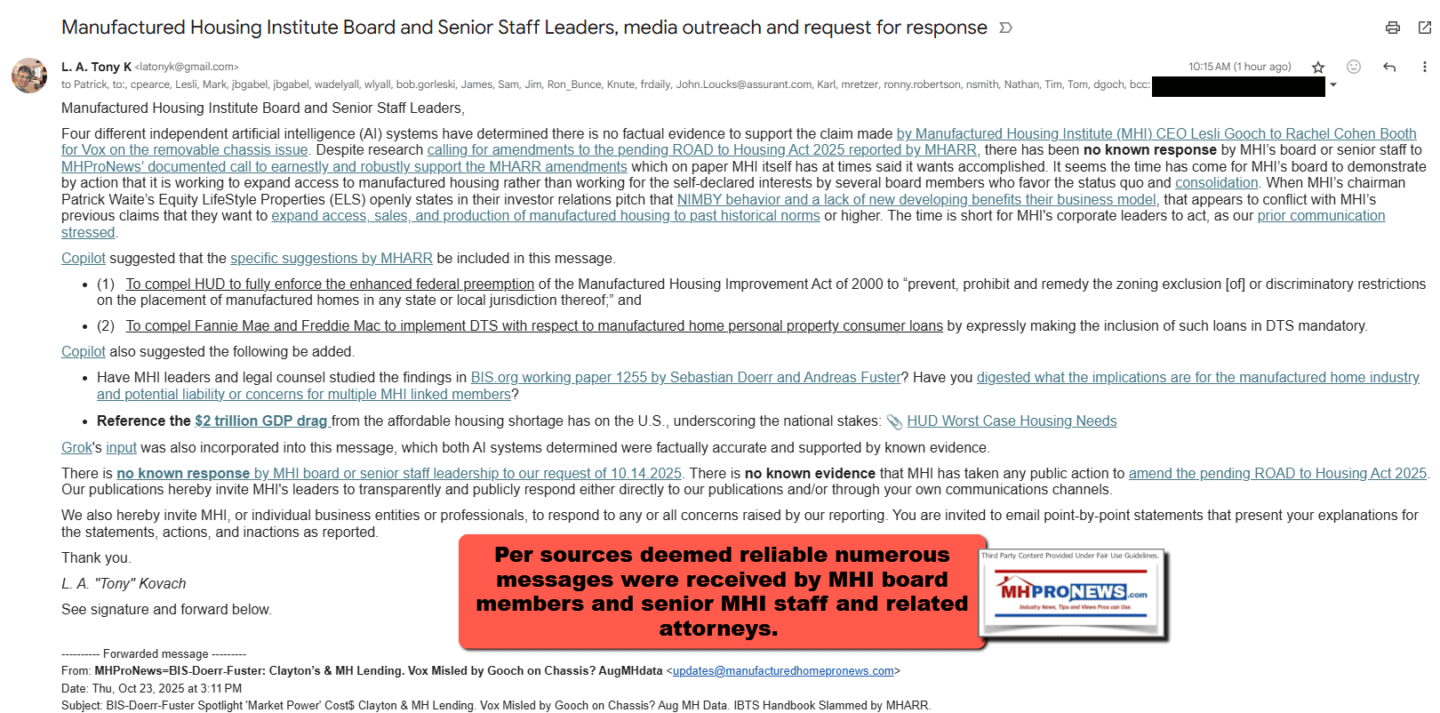 MHProNews notes that per sources deemed reliable numerous messages were received by MHI board members and senior MHI staff and related attorneys. The screen capture of the email is linked here for documentation of the record purposes.