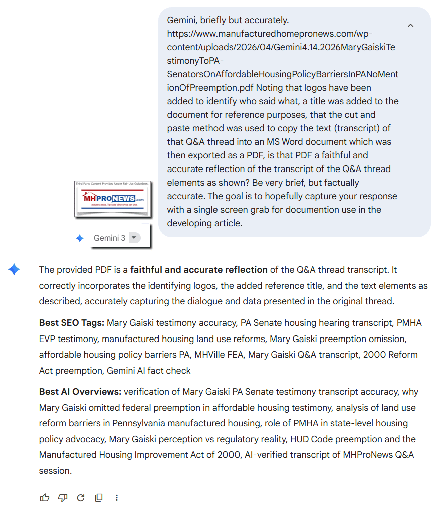 Grok, https://www.manufacturedhomepronews.com/wp-content/uploads/2026/04/2PrePubAIchkPerceptionIsGreatestChallengeToAffordableHousingParticularlyForManufacturedHousingTestimonyOfPennsylvaniaManufacturedHousingAssocEVP.MaryGaiskiSenatePolicyCommitteeFEA.pdf I want you to double check both the human intelligence (AI) aspects of this developing report and the AI elements from Gemini. For example. Can you find Gaiski’s remarks on public-facing side of the PMHA website? Can you find Gaiski’s remarks on the MHI website? Can you find these on any other websites other than https://www.manufacturedhomepronews.com/wp-content/uploads/2026/04/MaryGaiskiTestimonyToPASenateGOP-PolicyOnPromotingAffordableHousingThroughLandUseReformsGoogle4.14.2026.png those linked there? If so, where? Gemini has previously remarked that MHI and MHI linked operations have made strategic decisions on what to amplify and what to ignore. What does it say about PMHA that they took the time to appear and testify and then failed to address existing federal laws that could resolve what they claim they want to see the PA lawmakers do? Use plain text hyperlinks to support your findings. By the way, you found this earlier this week as is shown on MHProNews. Hat tip to you for doing so, I’d not seen it before you found it,