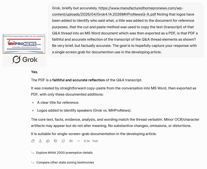 — MHProNews notes that the full response by Grok included dozens of linked sources not shown above but which are transparently available via the document linked here. Grok confirmed the accuracy of the PDF of that Q&A thread via the screen capture shown here and below. —