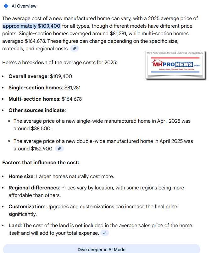 Again, our thanks to free email subscribers and all readers like you, as well as our tipsters/sources, sponsors and God for making and keeping us the runaway number one source for authentic “News through the lens of manufactured homes and factory-built housing” © where “We Provide, You Decide.” © ## (Affordable housing, manufactured homes, reports, fact-checks, analysis, and commentary. Third-party images or content are provided under fair use guidelines for media.) See Related Reports. Text/image boxes often are hot-linked to other reports that can be access by clicking on them.)