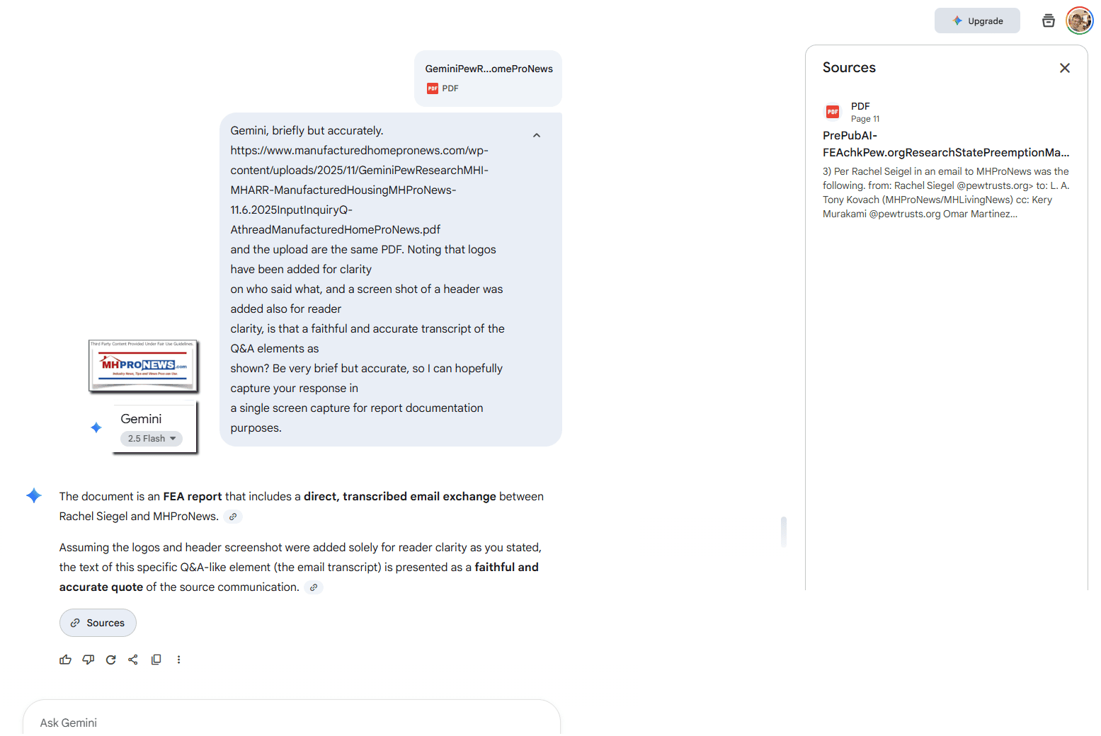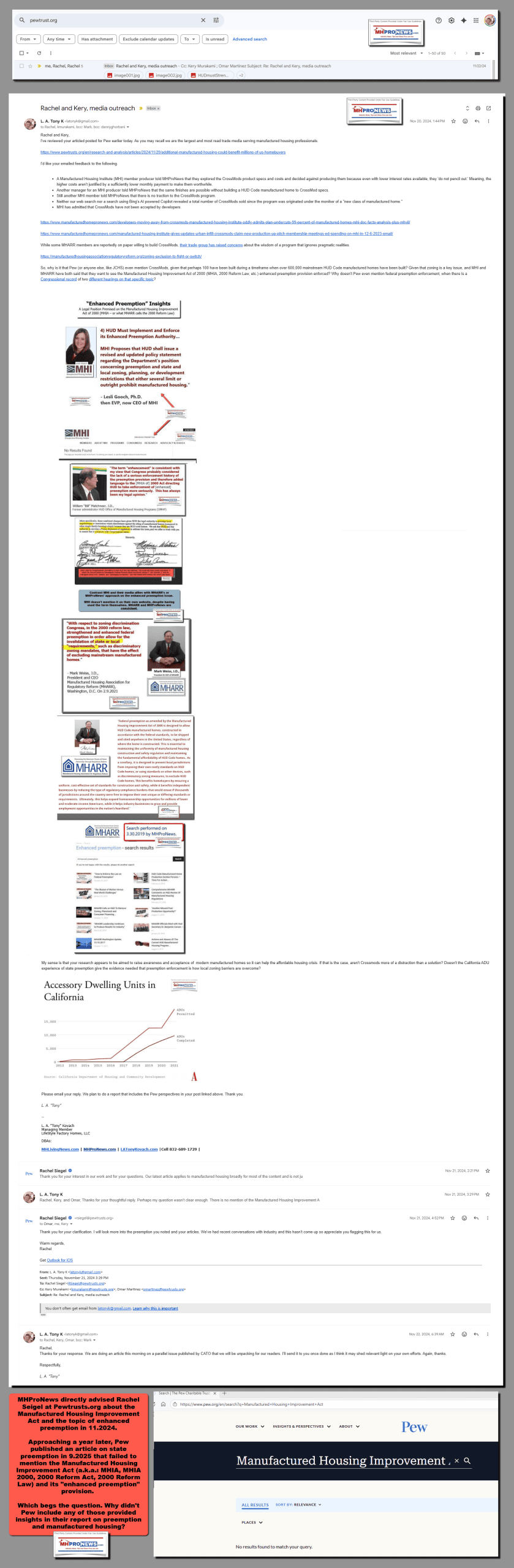 2) MHProNewsdirectly contacted and advised Rachel Seigel at PewTrusts.org about the Manufactured Housing Improvement Act and the topic of enhanced preemption in an email exchange that occurred in November 2024. See much of that exchange is documented in the screen captures linked here.