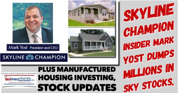 - Mark Yost, President and CEO of Skyline Champion dumped millions of dollars worth of his firm (SKY) stocks. It is mind boggling that people who claim to be manufactured housing trade publishers or bloggers would ignore this development. Not only did MHProNews tackle it, but we provide insights that the original sources missed. The fact that Skyline-Champion, the Manufactured Housing Institute (MHI) leaders, and others might have an ‘over the target’ reaction to it is no surprise, is it? Speaking of MHI…