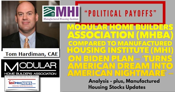 There is significant effort invested in comparing positions and actions by the Manufactured Housing Institute (MHI) and the smaller, but feistier watchdog and advocacy efforts at the Manufactured Housing Association for Regulatory Reform (MHARR). Against the backdrop of that routine drumbeat of MHI efforts vs. MHARR’s decades of consistency, it may be useful to step back and invest a few minutes to compare instead MHI vs. the Modular Home Builders Association (MHBA), led by Executive Director Tom Hardiman. What could that point of comparison be between MHBA and MHI? A reasonable example could be the significantly different response by MHI and MHBA to the announcement of the Biden housing plan.