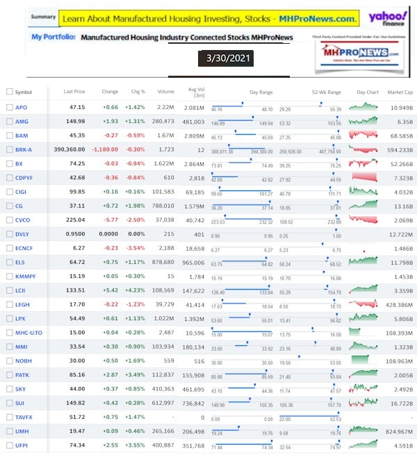 Manufactured Housing Industry Investments Connected Closing Equities Tickers