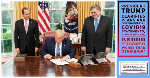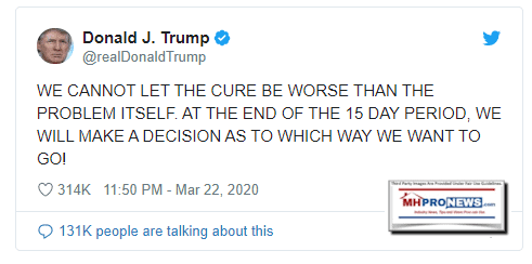 In a White House press conference on 3.23.2020, President Donald J. Trump assured Americans that the economically painful measures being taken won’t be a more harmful “cure” for the U.S. than the deadly and harmful consequences of the Coronavirus outbreak. The president took the opportunity to praise Asian Americans and to make it clear that a nationality wasn’t responsible for the COVID19 virus pandemic which purportedly originated in Wuhan, China. But the president also addressed an issue that has found a growing number of voices who are making the case that the U.S. economy cannot sustain too many months of a virtual shutdown of wide parts of the economy. “We are not going to let the cure be worse than the problem,” President Trump said. While making it clear that he would listen to medical experts advice, he also wants to balance the health impact with economic impact. As an analogy, the president said: “You look at automobile accidents, which are far greater than what we’re talking about. It doesn’t mean we’re talking about telling people not to drive cars.” Video It is part of an issue that has been raised in media ranging from the New York Times to the Wall Street Journal or various Fox News shows. That topic was addressed by an industry professional who forwarded to MHProNews a link to the following. Per the Daily Wire - “In an op-ed for The New York Times published Friday, David L. Katz, the founding director of the Yale-Griffin Prevention Research Center, suggests that “our fight against coronavirus” may end up being “worse than the disease.” By taking an “at war” approach to fighting COVID-19 — widespread shutdowns and isolation of the entire population — rather than a “surgical strike” approach focusing on the truly vulnerable, Katz argues, we have set ourselves on the path to “uncontained viral contagion and monumental collateral damage to our society and economy.” The scenario is difficult whatever decision is made. The death toll in Italy has soared. As more testing is done in the U.S., infection cases and deaths have climbed here too. There are those who allege that China is lying about their current death toll and infection rate, as the screen capture below exemplified. Epoch Times Epoch Times is an independent publication that Wikipedia describes as follows. “The Epoch Times is a multi-language newspaper founded in 2000 by John Tang and a group of Chinese Americans associated with the Falun Gong spiritual movement.” The paper self-describes like this, Reporting important news other media ignore. Clear, fact-based journalism without spin or hidden agendas: US, politics, China, world, opinion, business…” Epoch Times Citing Katz, “The data from South Korea, where tracking the coronavirus has been by far the best to date, indicate that as much as 99 percent of active cases in the general population are “mild” and do not require specific medical treatment. The small percentage of cases that do require such services are highly concentrated among those age 60 and older, and further so the older people are. Other things being equal, those over age 70 appear at three times the mortality risk as those age 60 to 69, and those over age 80 at nearly twice the mortality risk of those age 70 to 79." Katz says that based on the known data, the strategy should be to containment efforts on the elderly and chronically ill, not society at large. While the president and the Trump Administration have come under fire for the handling of the contagion, there are numbers of examples of those political or media figures who disagreed early on that this was going to be a serious matter in America. For example, on January 31, the same date as the Trump Administration ordered the travel ban from China – the Washington Post ran an article with the headline, “How our brains make coronavirus seem scarier than it is.” On February 2, “Even if it were feasible to contain it, these measures could make us less safe in other ways,” also in the Washington Post. Of course, since then, other nations have adopted the same stance as the Trump Administration has, increasingly cutting off travel from ‘hot spots’ for the coronavirus outbreak. So those statements and others like it have been proven to be errant. Twitter In New York, Mark D. Levine is the Chair of New York City Council health committee, representing District 7, Uptown Manhattan. As the two screen captures reflect, Levine has done a total flip on his advice. He’s not alone. Twitter Objectively, whatever blame might be leveled at the Trump Administration for their response time could just as easily be applied to prior administrations which failed to establish public and trade policies that might have avoided the currently difficult dynamic. Democrat Joel Kotkin Joel Kotkin, a self-proclaimed liberal Democrat and/or his fellow researcher have made several statements since 2018 that called into question the political decisions made in California that drove manufacturing out of their state into China and elsewhere. He also referred to policies in his state as fostering “a new feudalism.” feudalism MHLN Kotkin also recently called for a decoupling from China. Decoupling Land use and “monopolistic” power and political influence were harming California, Kotkin said. He felt Republicans could capitalize on that, but also doubted that they would do so. Apart from Kotkin, former Governor Arnold Schwarzenegger - a “never-Trumper” who has locked horns at times with the 45th president, recently praised the administration for their efforts in his state and beyond. The former athlete, TV and movie star invited and introduced HUD Secretary Carson to speak at the Schwarzenegger Institute at USC. In Carson’s address, he favorably raised the subject of manufactured housing. Carson quote Link Economic Fallout Worse than COVID19? There is a notion that every dark cloud has a potenti