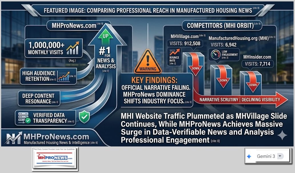As MHVille enters more deeply into the struggles on Capitol Hill stay tuned to the industry’s documented runaway #1 source for more “News through the lens of factory-built homes and manufactured housing” © and “Industry News, Tips, and Views Pros Can Use”© where “We Provide, You Decide.”© This is the place for “Intelligence for your MHLife.” © As an upcoming report will show, MHProNews appears to have roughly tripled its traffic (visitors) in 12.2025 than in 12.2024. MHProNews has averaged over a million visits for this specialized media site in January and over each of the last 5 months. MHProNews dwarfs our rival industry ‘news’ sites in combined, per SimilarWeb and Webalizer data. Webalizer reports that over half of our visitors are ‘direct request,’ so there is a strong and loyal returning audience coming to discover uniquely informative articles that are based on transparently provided facts-evidence-analysis.