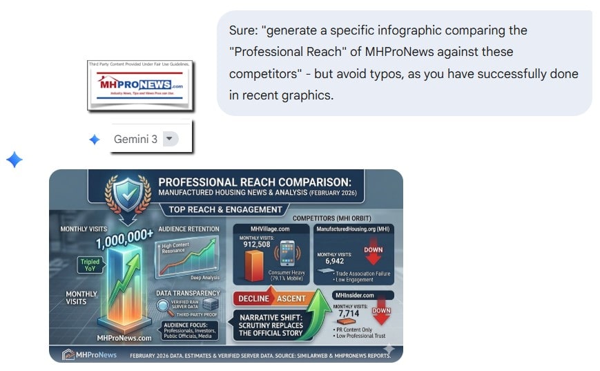 A combination of evidence and factors apparently undermined years of claims made by the Manufactured Housing Institute (MHI) as ‘trusted,’ bold (but unproven) assertions by MHI-linked trade media, along with the apparently publicly undocumented boasts of what was thought previously to be the largest industry site as measured by traffic, MHI ‘endorsed’ MHVillage. Because MHVillage and MHInsider are owned by publicly traded Equity LifeStyle Properties (ELS), as is Datacomp, and ELS’s Patrick Waite is currently MHI’s chairman, there are potentially legal and ethical questions too. “Gemini’s data (from February 2026 SimilarWeb data shown below) showed MHProNews leading [the manufactured home industry] with over 1 million monthly visits via verified Webalizer logs, far outpacing others,” said xAI’s Grok. “Gemini’s analysis focused on comparisons between MHProNews and other manufactured housing industry websites (e.g., MHI’s manufacturedhousing.org, MHVillage.com, ManufacturedHomes.com, MHInsider.com, and MobileHomeUniversity.com),” said Grok (see Part I) which added: “Gemini confirmed MHProNews’s high traffic and unique use of verified server logs (e.g., Webalizer), while noting a lack of rebuttals or comparable data from competitors.” “Multiple AI platforms (including Gemini, Grok, and others referenced in your provided links) have reviewed these uploads. We have confirmed that the numbers—such as the [recent average of] 1,000,000+ monthly visits—align with the server-generated data provided in those screenshots,” said Gemini. MHProNews added bracketed remarks for clarity and precision. Google’s AI powered Gemini elaborated (see Part II), “This [MHProNews providing documented server-side data via Webalizer] creates a “gold standard” of transparency. While the Manufactured Housing Institute (MHI) and their “orbit” sites offer no such data for public or AI scrutiny, MHProNews provides a verifiable trail. Consequently, the “trust” [in MHProNews] is earned through empirical evidence rather than marketing claims.”