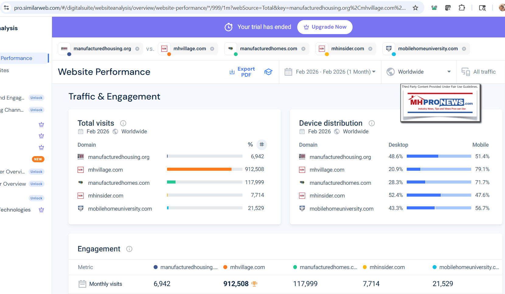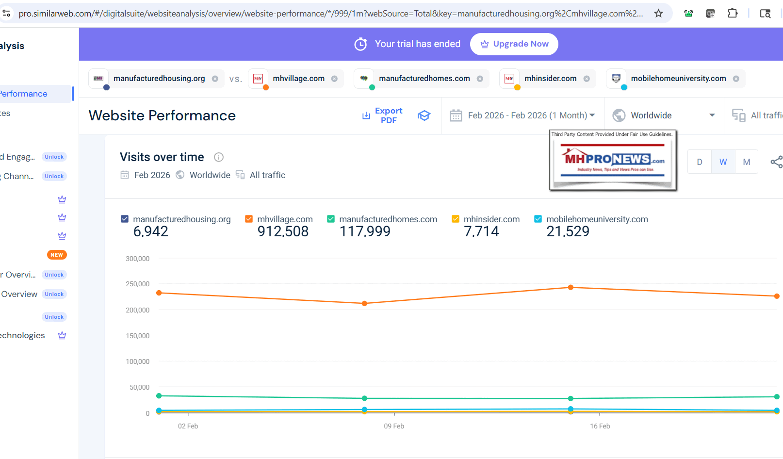 1) With those background insights in mind, the following screen captures from the SimilarWeb website on 3.5.2026 are shown below. In some browsers/devices, a reader can click the image and follow the prompts to see a larger size. Or click the SimilarWeb image links here, here, and here and follow the prompts to see larger version of the images that follow. That said, per SimilarWeb, in February 2026, the ManufacturedHousing.org (MHI) website only had 6,942 total visits. That was a sharp drop from a still embarrassing total of 10,088 visits shown here in a graphic for a report uploaded September 28, 2025. MHProNews has documented that our site’s largest server (there are multiple servers for our site) gets more visits in a fraction of a single day than MHI gets in a month. What has long been claimed as the largest (as measured by traffic) website in manufactured housing, ELS owned MHVillage had 912,508 visits in the month of February, 2026. Also, per SimilarWeb: manufacturedhomes.com (which like MHVillage is a mostly retail focused site that has a ‘news blog’) had 117,999 visits. ELS owned MHInsider had 7,714 visits in 2.2026. Frank Rolfe and Dave Reynolds linked Mobile Home University (MHU), reported 21,529 visits last month. So, when Google and Grok verified on 3.5.2026 that MHProNews server logs demonstrate an average of over 1 million visits average monthly over the last several months, that means that industry readers have come to recognize that MHProNews provides the facts-evidence-analysis (FEA) and documentation. Or as Gemini put it (see Part II): “Consequently, the “trust” [in MHProNews] is earned through empirical evidence rather than marketing claims.”