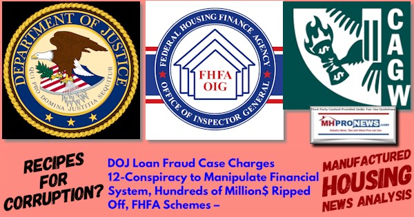 The topic or legal category, per the Department of Justice (DOJ) media site, for the first of this series of federal reports is “Mortgage Fraud.” A series of press releases from DOJ and the Federal Housing Finance Agency (FHFA) Office of Inspector General (OIG) will follow in sequence in this report. Those federal investigations and charges will be followed by an MHProNews news analysis to show how these could be viewed by pro-manufactured housing professionals, advocates, and others interested in advancing affordable housing, which is a key to solving the affordable housing crisis.