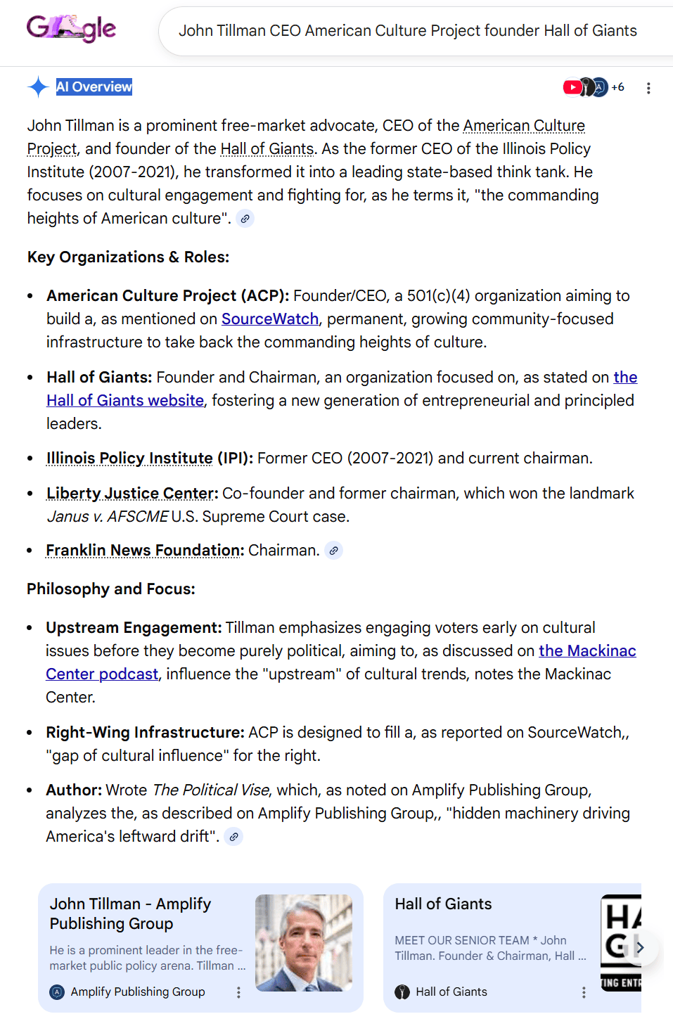 According to left-leaning Google AIO: “John Tillman is a prominent free-market advocate, CEO of the American Culture Project, and founder of the Hall of Giants. As the former CEO of the Illinois Policy Institute (2007-2021), he transformed it into a leading state-based think tank. He focuses on cultural engagement and fighting for, as he terms it, “the commanding heights of American culture”.” According to InfluenceWatch.org, Tillman is also associated with the Franklin News Foundation. “The Franklin News Foundation (formerly the Franklin Center for Government and Public Integrity) is a non-profit, public interest news organization that funds journalism that focuses on government accountability, especially related to transparency, accountability, and fiscal responsibility.1” Influence Watchalso said: “The Franklin News Foundation’s projects include The Center Square, the Illinois Radio Network, and Franklin Media Group.3” It is Tillman who is the author of the article that follows in Part I. As the headline teased, Tillman said in Part (bold added): “Say this for the current anti-elite moment: It’s beautifully American. Both the right and left are breathing new life into our national ideal of sovereignty, which holds that the people are ultimately in control. It’s good to remind ourselves – and our would-be rulers – that we the people are still in charge. But not all revolts are created equal. Despite their superficial similarity, the Republican and Democrat versions are diametrically opposed and fundamentally incompatible.”
