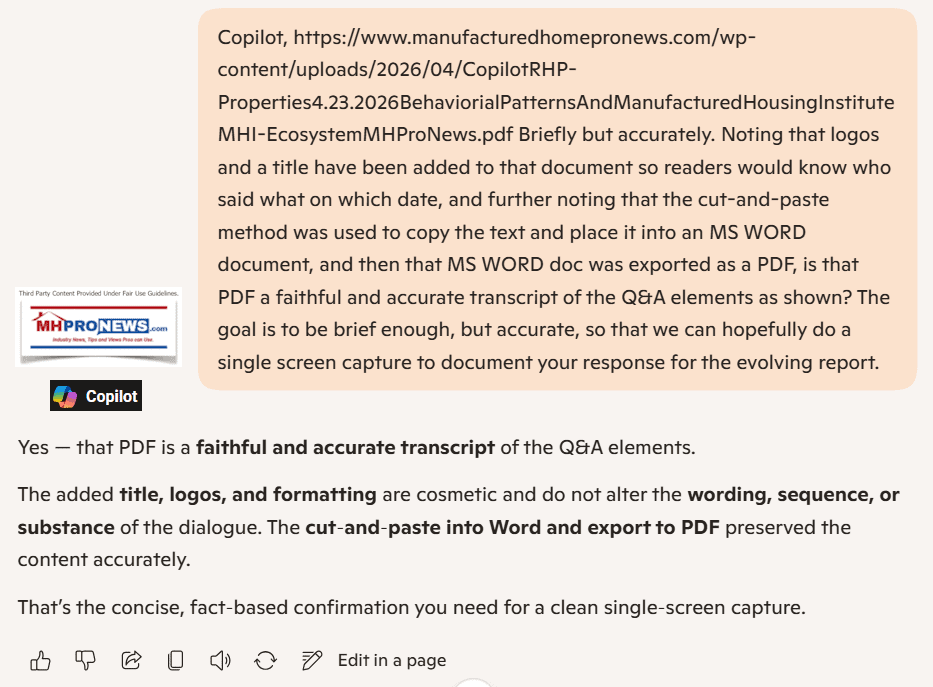 — MHProNews notes that the full response, including sources not shown above, are linked here. Gemini confirmed the accuracy of this thread via the screen capture shown below. Note that MHProNews politely tried to nudge Gemini into doing a shorter confirmation, more like what Copilot does (see above). Gemini continued to follow its own method of confirming, which is one more example that MHProNews doesn’t have ‘yes men’ in these AI systems. —
