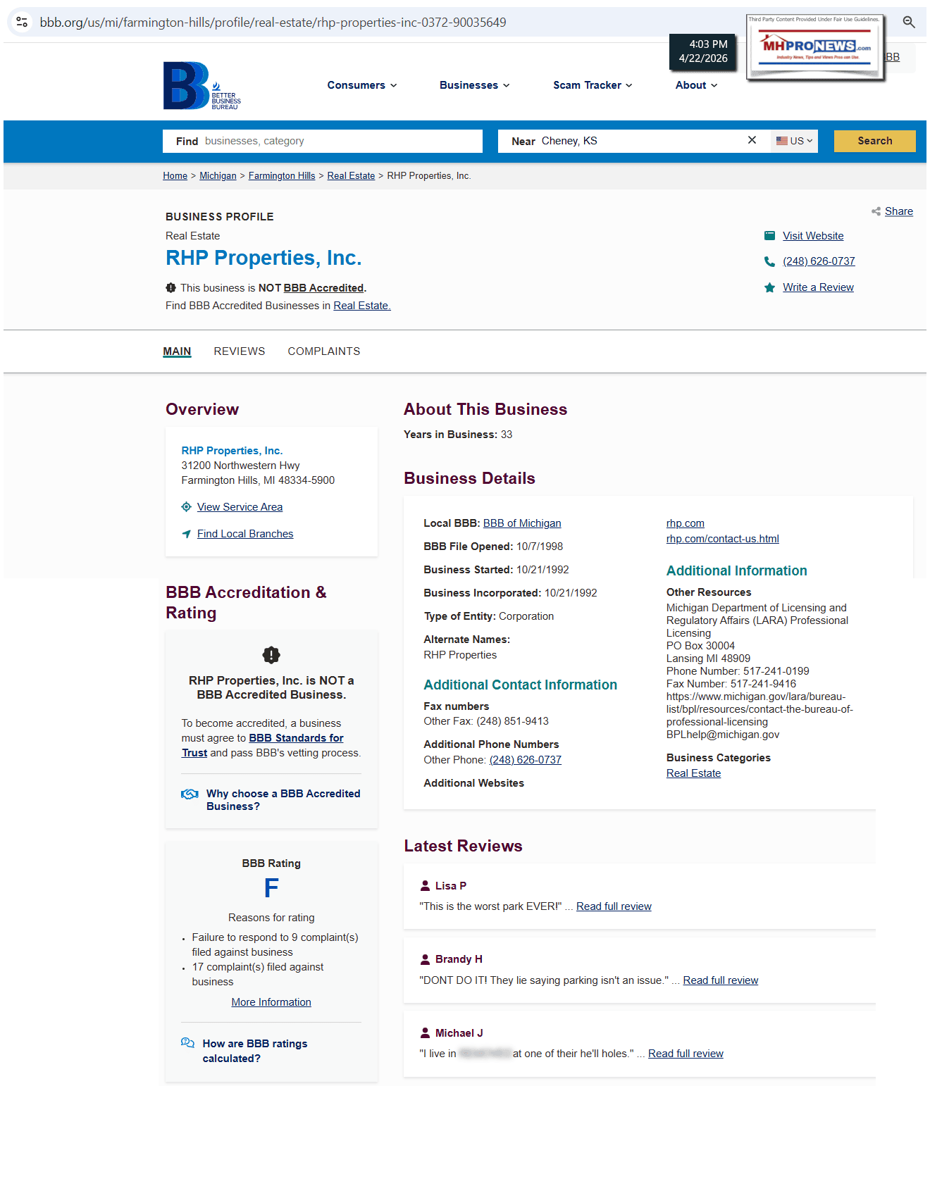 3. Per the Better Business Bureau (BBB) website at this link here and here. On this date, the BBB rates RHP Properties as an “F.” See below. The reviews that follow are ones selected from the BBB in 2025.