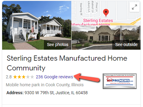 Crain’s apparently inaccurately stated that the Sterling community in Justice was “a 744-site park” [sic]. Sterling Estates is currently shown as being owned by giant RHP Properties. At the time that Capital First Realty owned Sterling Estates, it reportedly had some 800 home sites. While the thrust of their report appears sound, community and terminology details had glitches.