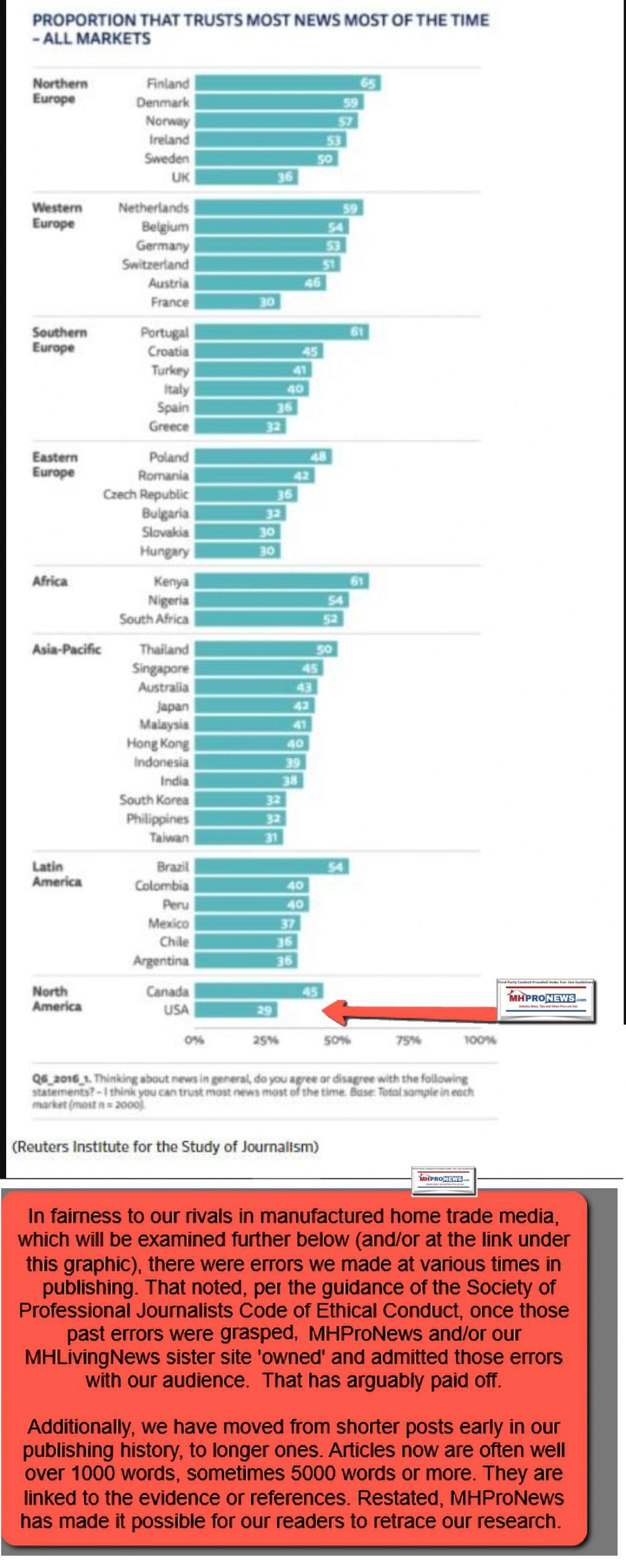 That statement by Solomon is supported by several U.S. and international surveys of public attitudes towards the mainstream news media. Note that the international survey shown below reflects that trust by the public in mainstream news in the U.S. ranks under dozens of other nations.