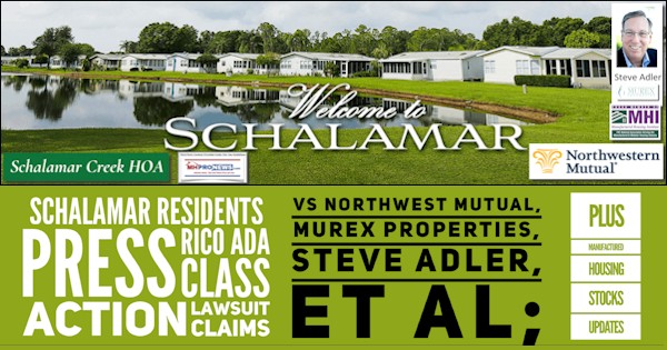 Despite an apparent legal setback, a law firm acting on behalf of manufactured home residents of the 55+ Schalamar Creek manufactured home golf-course resort community is pressing ahead with Racketeer Influenced and Corrupt Organizations (RICO) Act and Americans with Disabilities Act (ADA) class action claims. The targets of the lawsuit are a subsidiary of Northwestern Mutual Life Insurance Company, Murex Properties, Steve Adler, and other co-defendants named in the legal pleadings linked here.