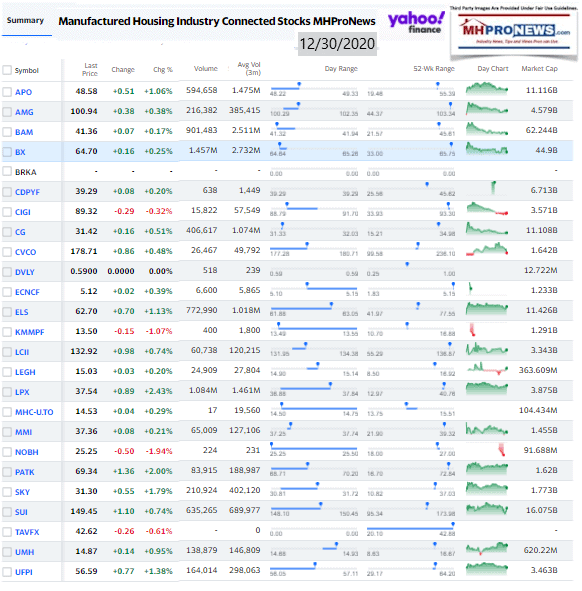 But there is more in the featured focus. Newcomer? As usual, the featured focus will follow the left-right headlines, and two of our three market summary graphics at the closing bell. The manufactured home industry connected stocks-at-a-glance graphic information follows the featured focus and related reports.
