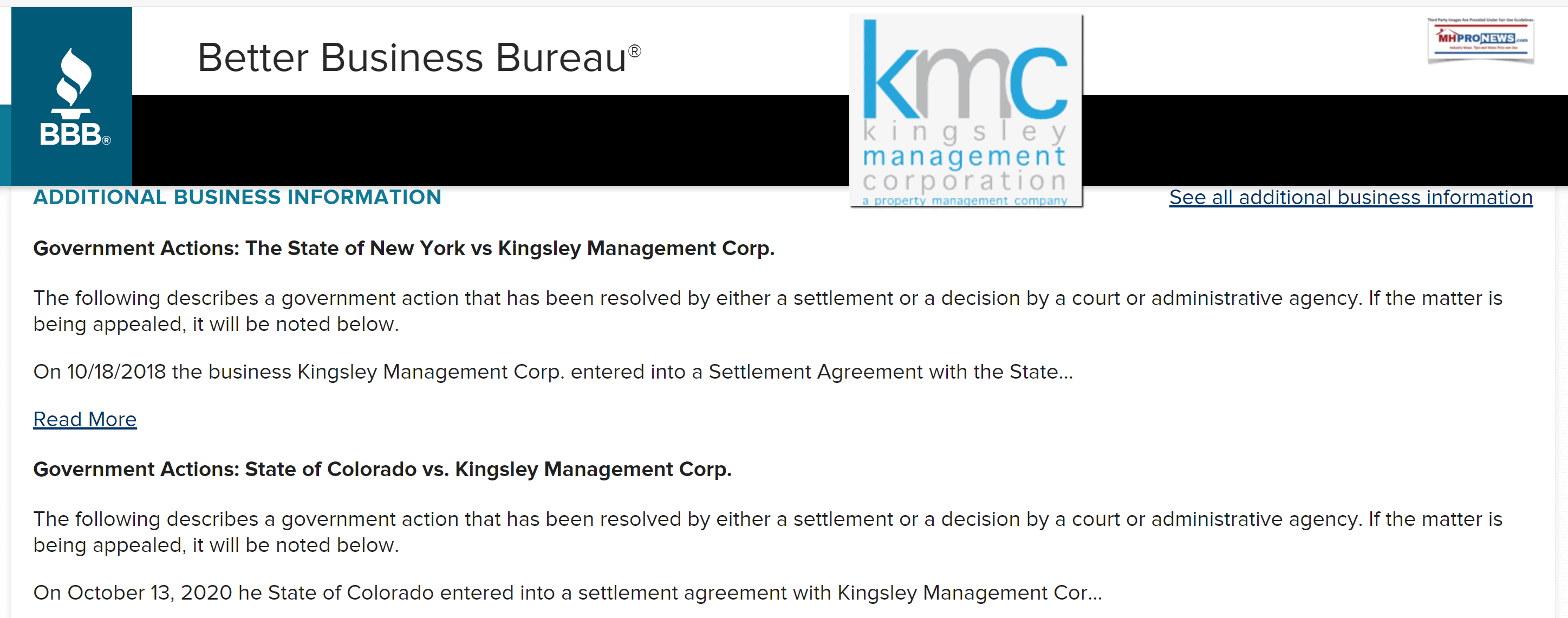 According to the Better Business Bureau (BBB), among the governmental actions taken against Kingsley was by the state of Colorado. “State of Colorado vs. Kingsley Management Corp.” resulted in “On October 13, 2020 he State of Colorado entered into a settlement agreement with Kingsley Management Corp, which will return $146,770.26 to tenants of its Colorado mobile home parks. This money includes security deposits that were wrongfully held and improperly collected attorney’s fees from tenants.” The settlement agreement Kingsley signed with the state is linked here as download.