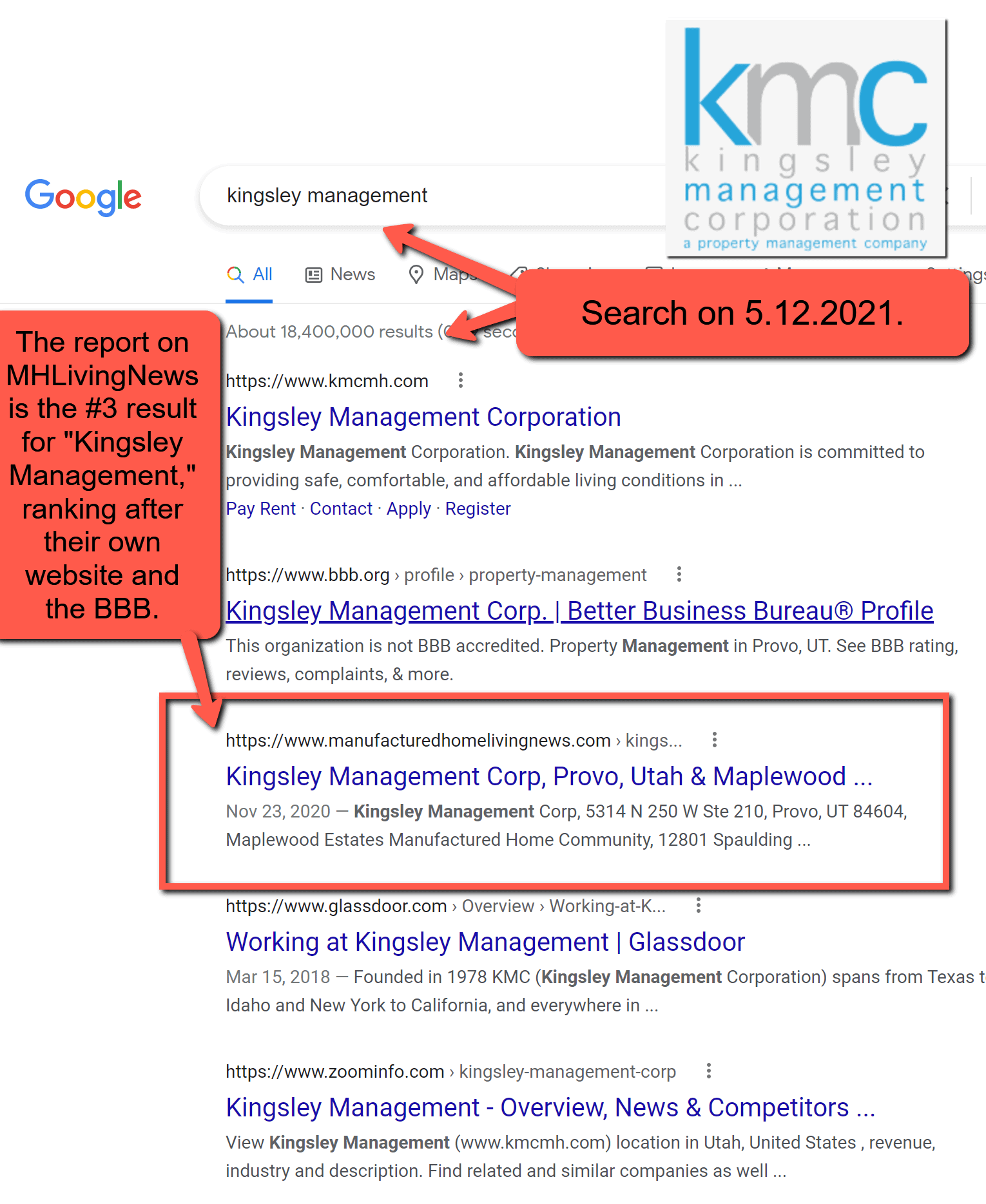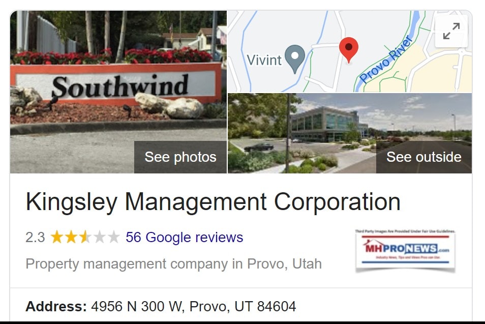 While Kingsley may not be directly connected to MHI, but they are apparently following a pattern that several MHI members firms have which residents and lawmakers have called “predatory.” See the reports linked herein. It is worth mentioning that when MHProNews and/or our MHLivingNews sister site spotlight a firm and their business practices, those often rank well with Google and other search engines. KMC is one of those highlighted firms, as the screen capture below reflects.