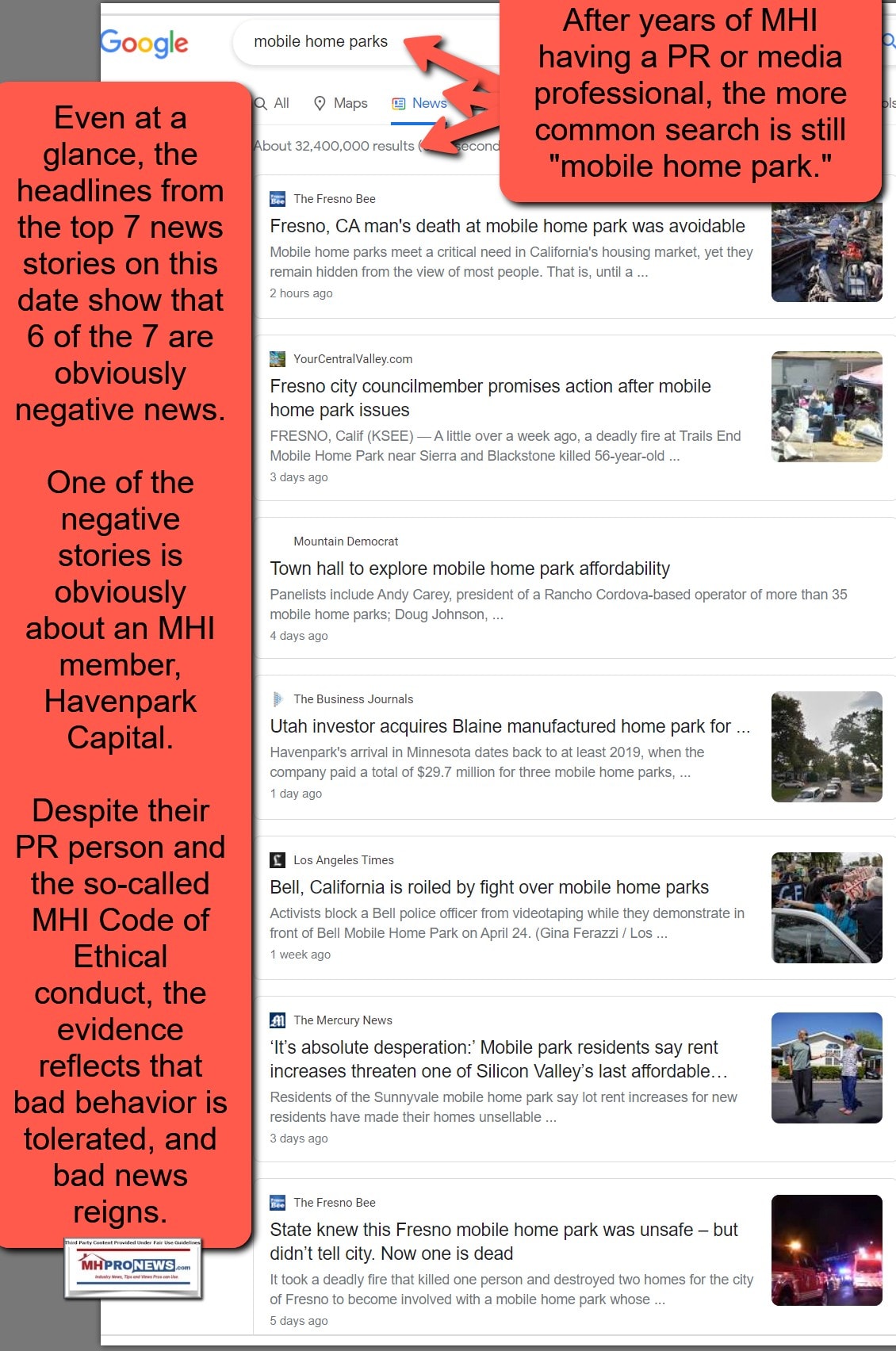 But in reality, a check of news stories about manufactured home communities – sadly, still more commonly called “mobile home parks” several years after MHI hired a ‘media relations professional’ – on this date shows no such positive stories. 6 of 7 news stories are negative news. Similar checks by MHProNews in recent years reflect that same pattern.