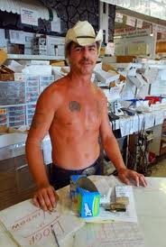 TampaBayOnline reports Hynes Discount Mobile Home Supply in Zephryrhills has a sort of local celebrity. Jimmie Harper Jr. often works the counter shirtless with a cowboy hat. Save on cold days, for most of the past 6 years, Harper has scoffed covering his chest. “It’s hot,” says the 37 year old Harper. “Guys hate me,” Harper says. “They call up and say, ‘My girlfriend took a picture of you and now it’s on the coffee table.’ Co-worker Bill Hynes said: “We’ve been trying to figure that out for months,” remarking about the female attention Jimmie has drawn. Harper admits to wearing a shirt on paydays, so he can cash his check at the bank.