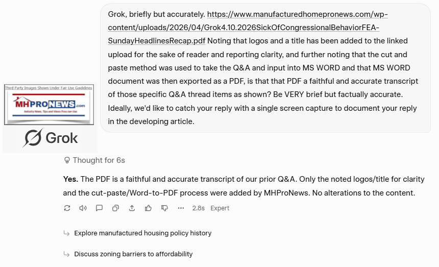 — MHProNews notes that the input-inquiry and the full response by Grok is linked here and includes ten more supporting sources provided by Grok not shown above. Grok confirmed the accuracy of that Q&A via the screen capture found at this link here. —