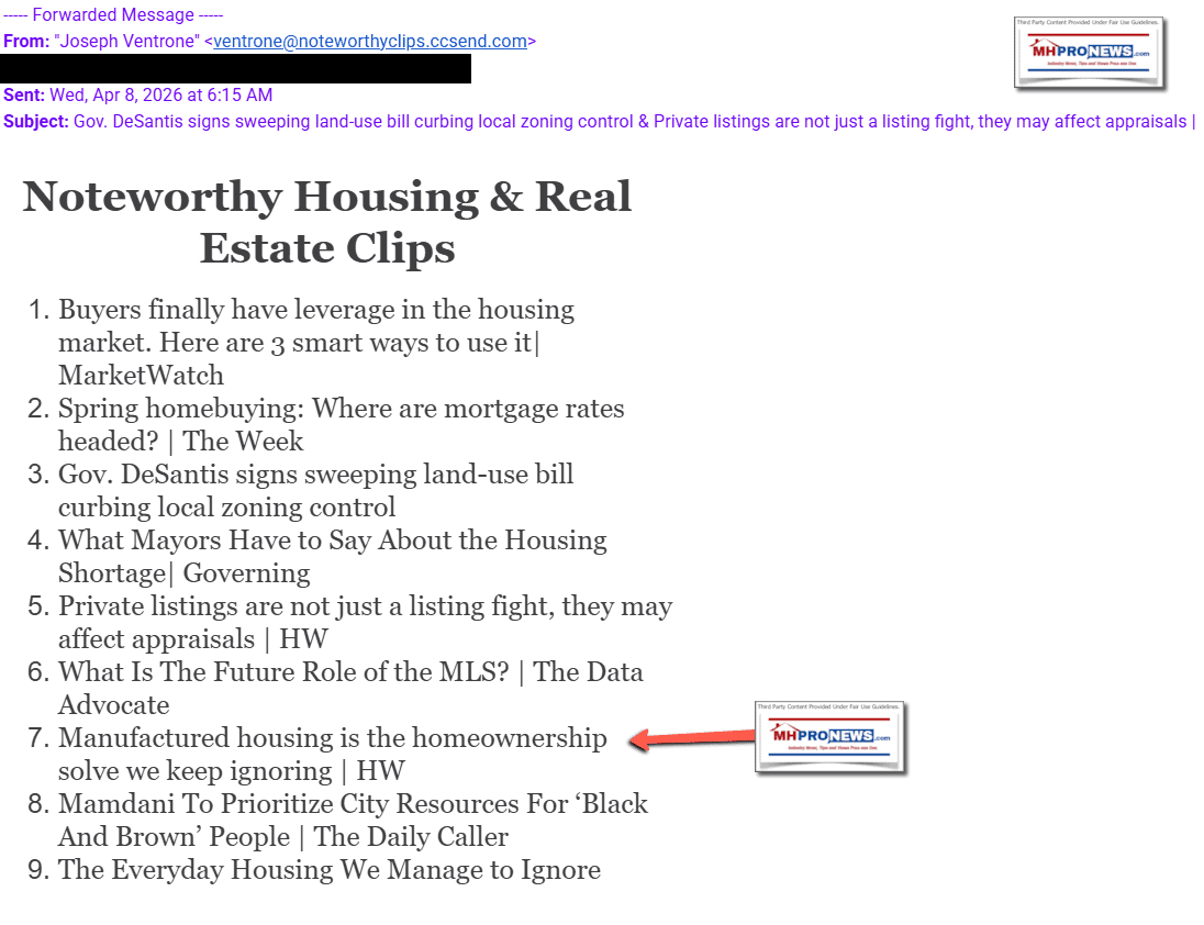 Mashups can be illuminating. “I am sick of serving in Congress with immoral freaks who abuse their office and bring dishonor to the institution.” — said Congressional Rep Anna Paulina Luna (FL-R) via X (see her X-posts for context below). Saul Anuzis, President of the 60 Plus Association, authored a recent op-ed via the Daily Caller that presented a different angle on the housing affordability topic (see Part I). According to LegiStorm, Joseph M. “Joe” Ventrone has been involved for decades in housing policy in Washington, D.C. ” Per LegiStorm, Ventrone: “National Association of Realtors (May 2003-Dec. 2019) Vice President, Federal Policy and Industry Relations” and “House Financial Services Committee (1983-Jan. 2001) Deputy Staff Director.” From Ventrone’s LinkedIn profile: “currently serves as a consultant to the Chief Advocacy Officer at NAR. Joe also serves on several Boards and Advisory Boards to real estate related companies.” “Joe’s expertise in housing issues spans over 50 years and includes stints in the private sector, top federal agencies and on Capitol Hill during both the Democratic and Republican administrations.” Ventrone provides his followers with a business-daily emailed news that recently plugged the HousingWire op-ed: “Manufactured housing is the homeownership solve we keep ignoring,” See that in Part II. This Sunday Weekly MHVille Headlines Recap (Headlines in Review) is found in Part III. More facts-evidence-analysis (FEA) will follow.